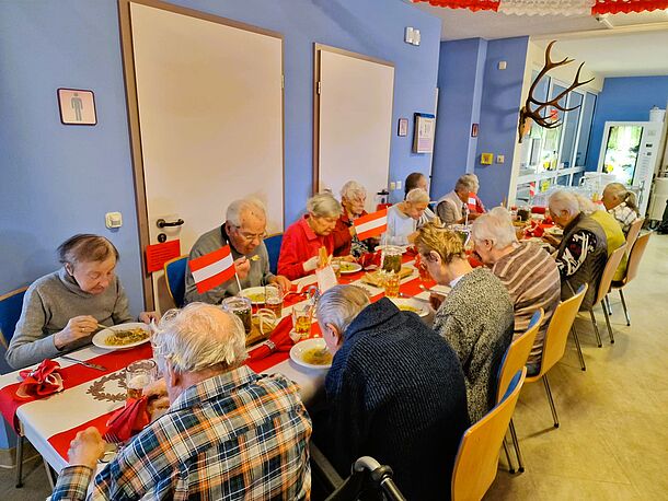 Letzte Woche fand unser diesjähriger Ländertag statt. Dazu gab es Informationen zu dem Land und ein gemeinsames Mittagessen. Frittatensuppe mit Schnittlauch zum Auftakt, anschließend Tafelspitz mit Krensoße, Petersilienkartoffeln und Kohlrabi-Karottengemüse. Zum Abschluss gab es Wiener Moccacreme mit Zwetschgen. Die klassische Sachertorte zum Kaffee und am Nachmittag großes Kino: Sissi Teil 1
